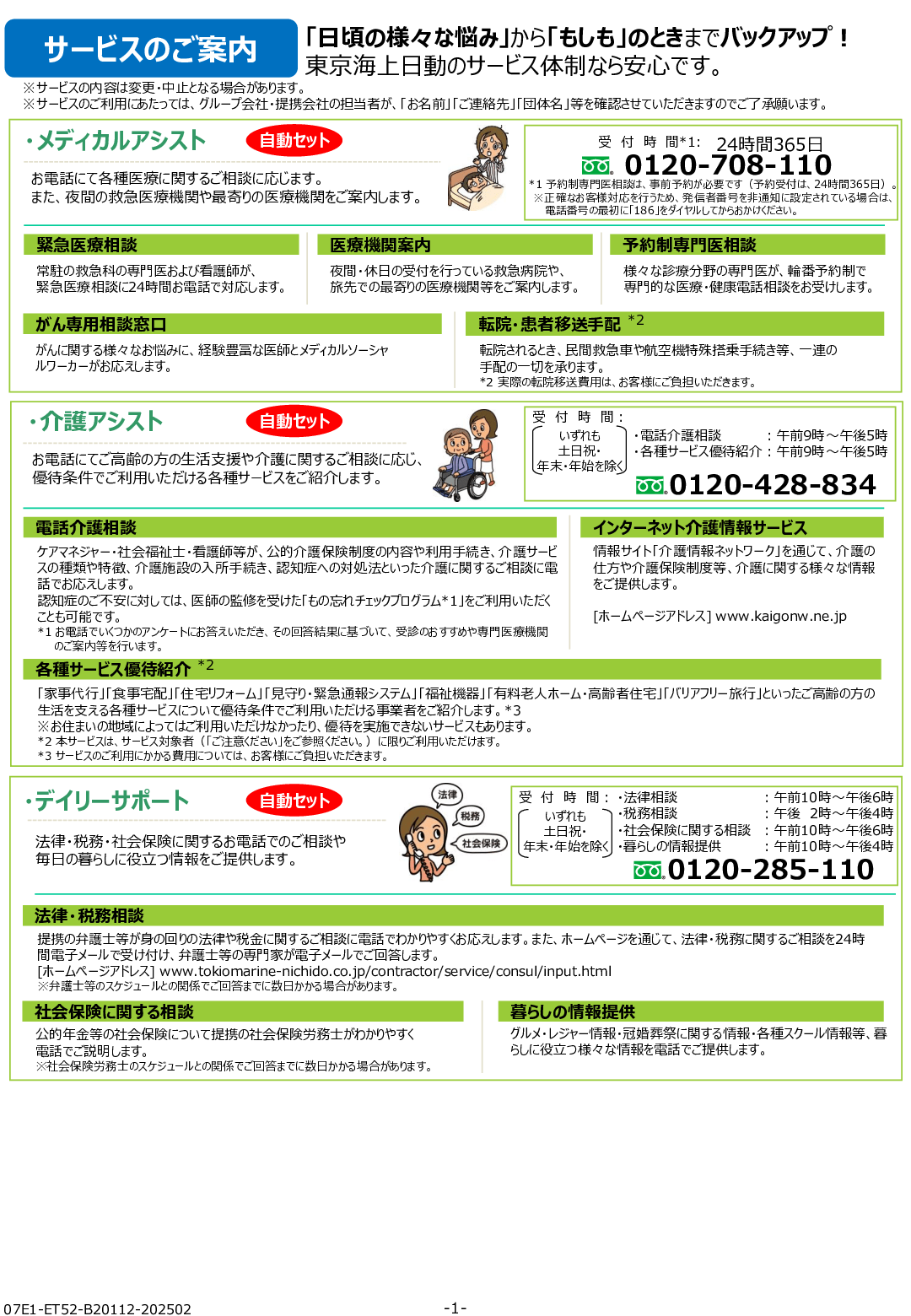 また東京海上グループのネットワークを活かし、優待条件でご利用いただける各種サービスを紹介します。法律税務等の相談も可能です。